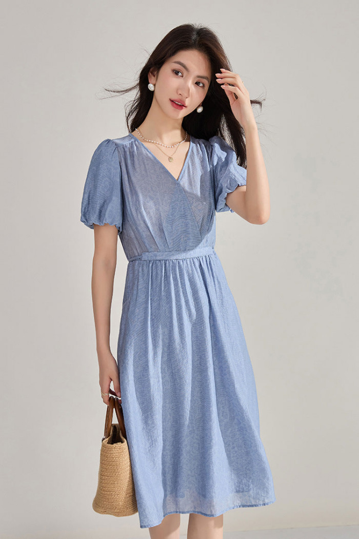 立体感のあるジャカード生地がクラシカルで上質な雰囲気を漂わせる一枚。Vネックのラインがデコルテをすっきりと見せ、大人でも自然に取り入れられる上品なプリンセス風スタイルに仕上がります。記念日ディナーやフォーマルな場にも映える華やかさが魅力です。
