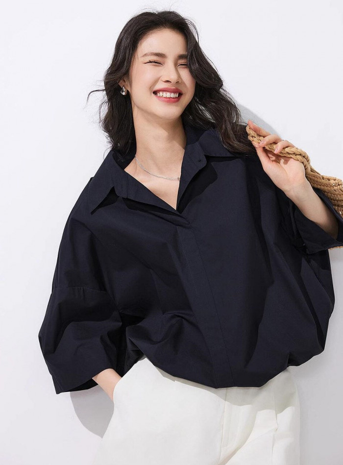 手首を美しく見せる七分袖に、ほどよいデザイン性を加えたシャツ。シンプルながらも袖のポイントが女性らしさを引き立て、ネイビーの深みが知的な印象をプラスします。オンオフ問わず活躍し、一枚で“できる女性”を感じさせるスタイルが完成。