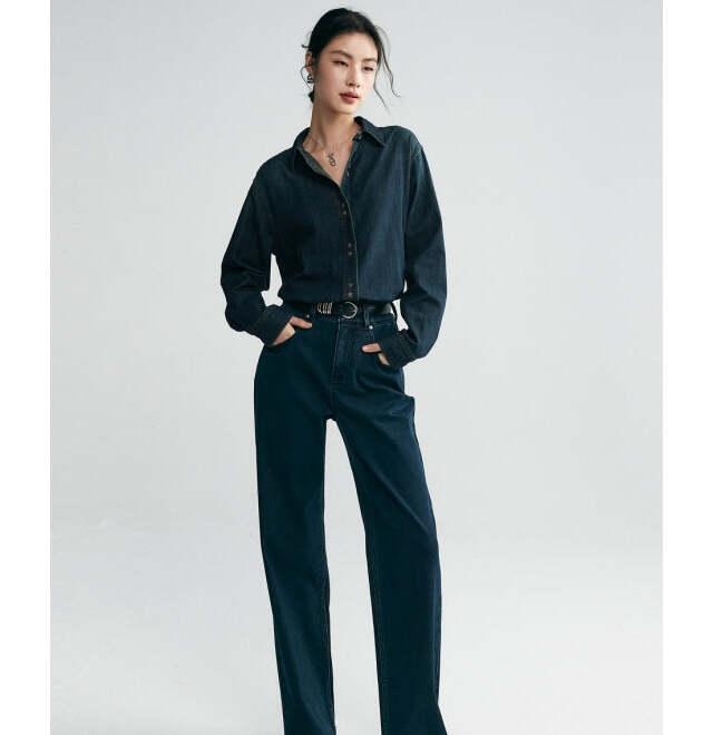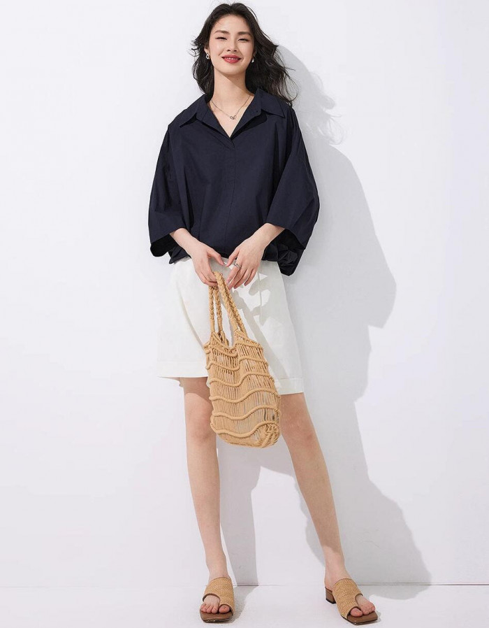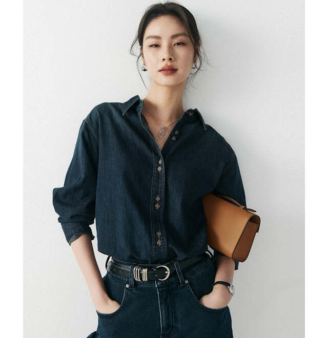 美白効果を狙いたい方や、知的で洗練された雰囲気を演出したい方におすすめなのがネイビーやブルー系のシャツ。顔映りをパッと明るくしながら、落ち着きと上品さを両立できる万能アイテムです。今回は大人の女性に似合うネイビーシャツをセレクトしました。