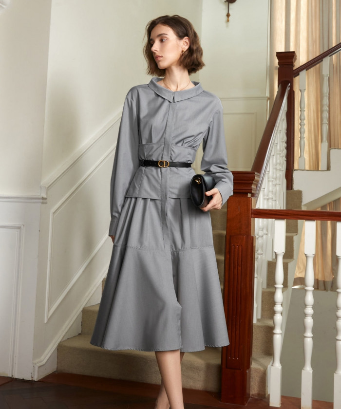 オフィスカジュアルの定番のシャツワンピースもシルエットにこだわったアイテムなら一気に垢抜けます。都会的なグレーとフェミニンなデザインで、大人きれいな愛されコーデの完成です。