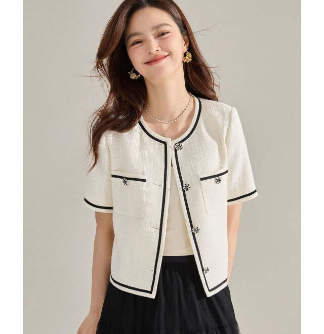 ノーカラーのすっきりとしたシルエットに、ポケット部分のバイカラーが印象的なショートスリーブジャケット。シンプルなデザインながらも立体感があり、スタイリングにモダンな雰囲気をプラスしてくれます。パンツ合わせでスタイリッシュに、スカートと合わせてフェミニンにと、幅広く活躍する一枚です。