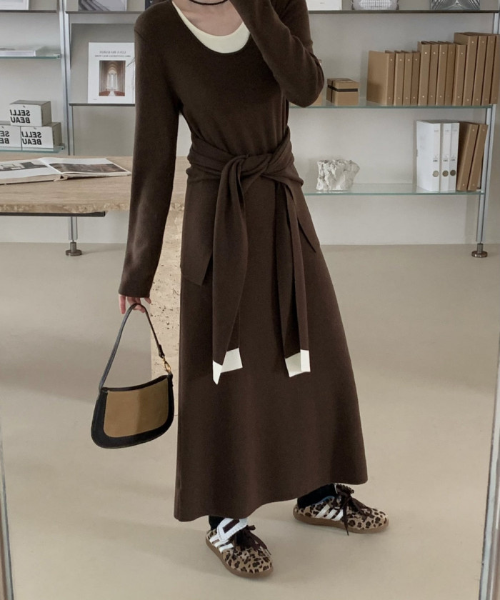 しっとりロング丈のワンピースも、インナーに白Tシャツを仕込んだようなデザインがカジュアルに見せてくれ、スニーカーにもよく馴染む1枚に。付属のショールはまるでカーディガンのような見た目です。レイヤードがまだ暑い時期にレイヤード風がありがたい。