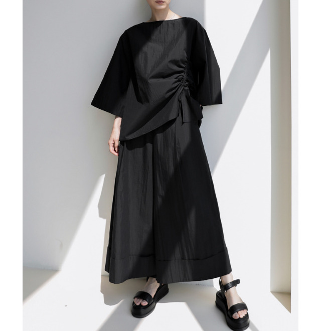 ゆったりとしたトップスとワイドなボトムスをセットで着用するのがおすすめ。アシンメトリーなドレープとギャザーがアクセントになり、全身ブラックでも単調にならず立体感のある仕上がりになります。リラックス感とモード感を兼ね備え、日常から特別なシーンまで幅広く対応できる万能アイテムです。