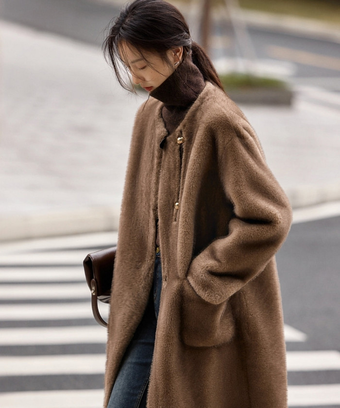 存在感のあるモコモコ素材が可愛らしくも、大人らしい上品さを引き立ててくれるロングコート。ノーカラーデザインなので首元はすっきりと見え、ストールやタートルニットとも好相性です。ブラウンカラーの優しい雰囲気が冬の街に映え、羽織るだけで温かさと安心感を感じられる一枚です。