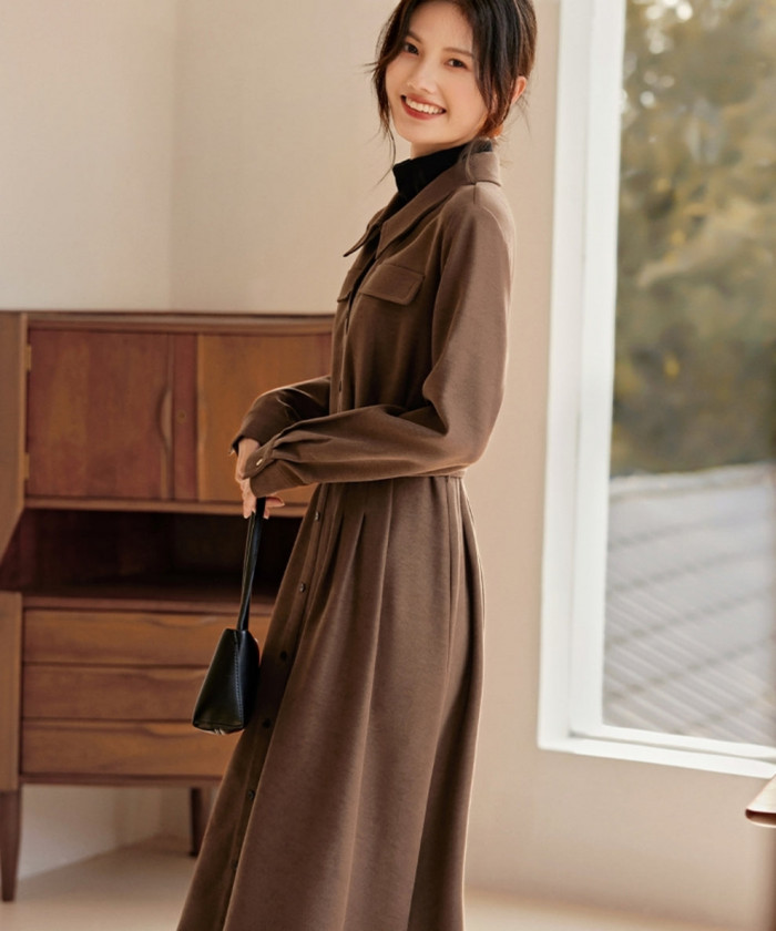 落ち着きのあるブラウンカラーが、知的で洗練された印象を与えるシャツワンピース。付属のベルトでウエストをキュッと締めれば、女性らしいシルエットが自然と生まれます。ジャケットを合わせて通勤にも、ブーツをプラスして休日のお出かけにも対応できる万能さが魅力。大人の余裕を感じさせる一枚です。