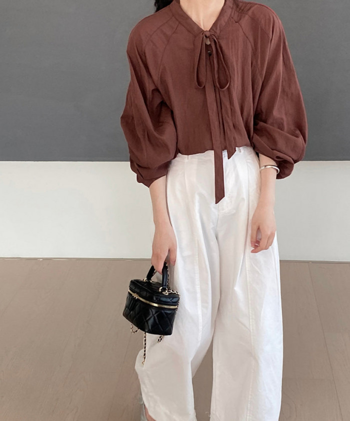 ふんわりとした丸みを帯びたボリューミーなシルエットが、非常にキュートな印象を演出してくれるリボンタイブラウス。シルエットとは対照な、直線的でコンパクトなリボンタイはふんわりとした雰囲気もクラシカルな大人っぽさに締め上げてくれます。深いバーガンディーの色味も大人っぽさが演出できます。