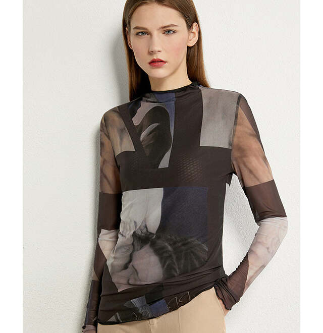 直線や四角で囲うように配色が切り分けられた、独特な雰囲気のある個性的なシアートップス。落ち着いた色味の組み合わせが大人っぽいですが、個性的なデザインなのでコーディネートにワンアクセントを加えることができます。もちろん、1枚でもレイヤードでも着回せるので、使い方は様々です。