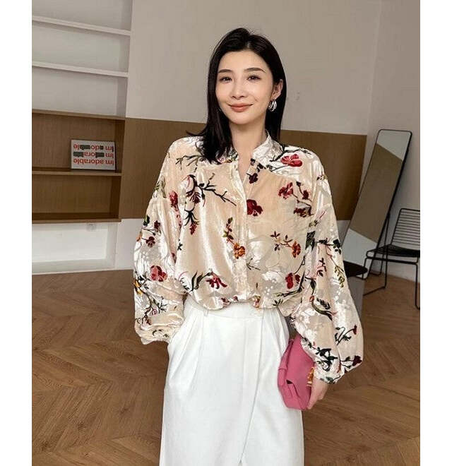 花柄模様がレトロ中華で可愛い雰囲気。花柄プリントシャツ