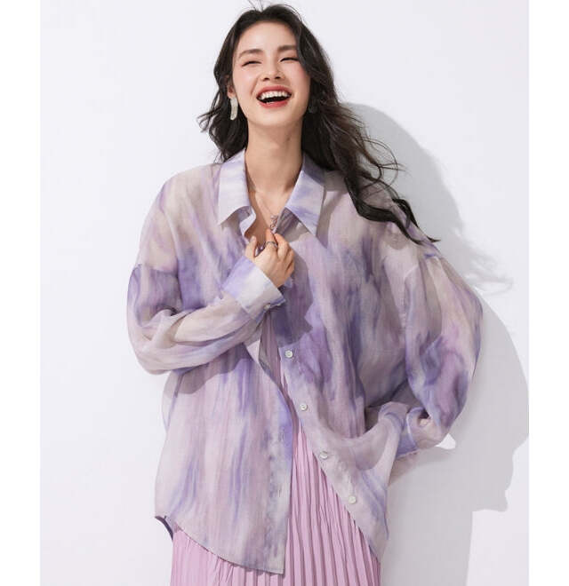 カジュアルな中にもフェミニンな印象。マーブルプリントシャツ