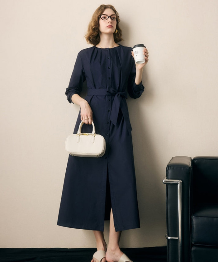 ウエストリボンがポイントになったシャツワンピース。濃いネイビーカラーが印象的です。ホワイトの小さめバッグを持って、リッチ感をプラス。