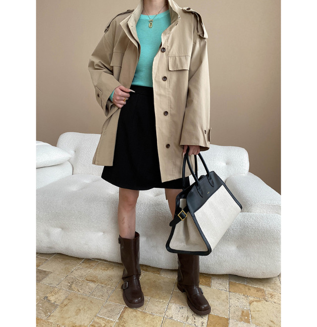 今っぽさを程良く愉しみたい人におすすめなのが、定番アイテムでのトレンド取り入れ。トレンチコートなら、多少デザインで遊んでもきちんと感は保てますよ。こちらはエポレットや胸ポケット、前立てなどを一回り大きくすることで、昨年までとはひと味違う仕上がりに。