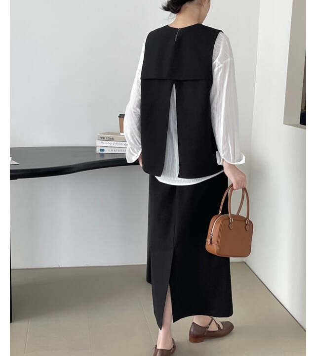 何だかコーデが物足りない。そんな時にサッと重ねるだけで雰囲気を変えられるプレーンなベスト。シンプルながらもバックスリットが入っており、後ろ姿まで抜かりない。実は揃いのスカートを購入すればセットアップとしても着られ、きちんと見えも叶える優れものなんです。