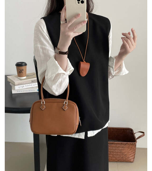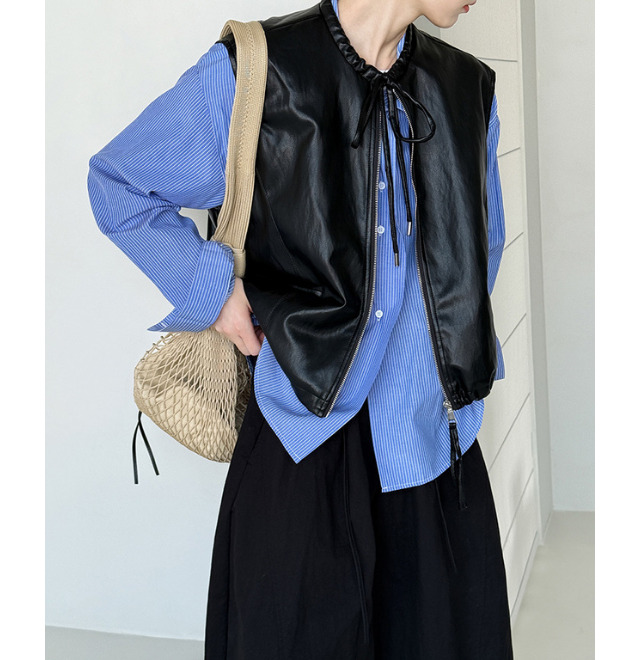トレンド感と秋らしさ、一挙両得なレザーアイテム。ジャケットやパンツだと分量が多すぎて二の足を踏む、という人にもちょうどいいのがベストです。レザーのハードな印象が苦手な人にも着やすいリボン付き。きゅっと絞れば首元にギャザーが出来てよりフェミニンに。