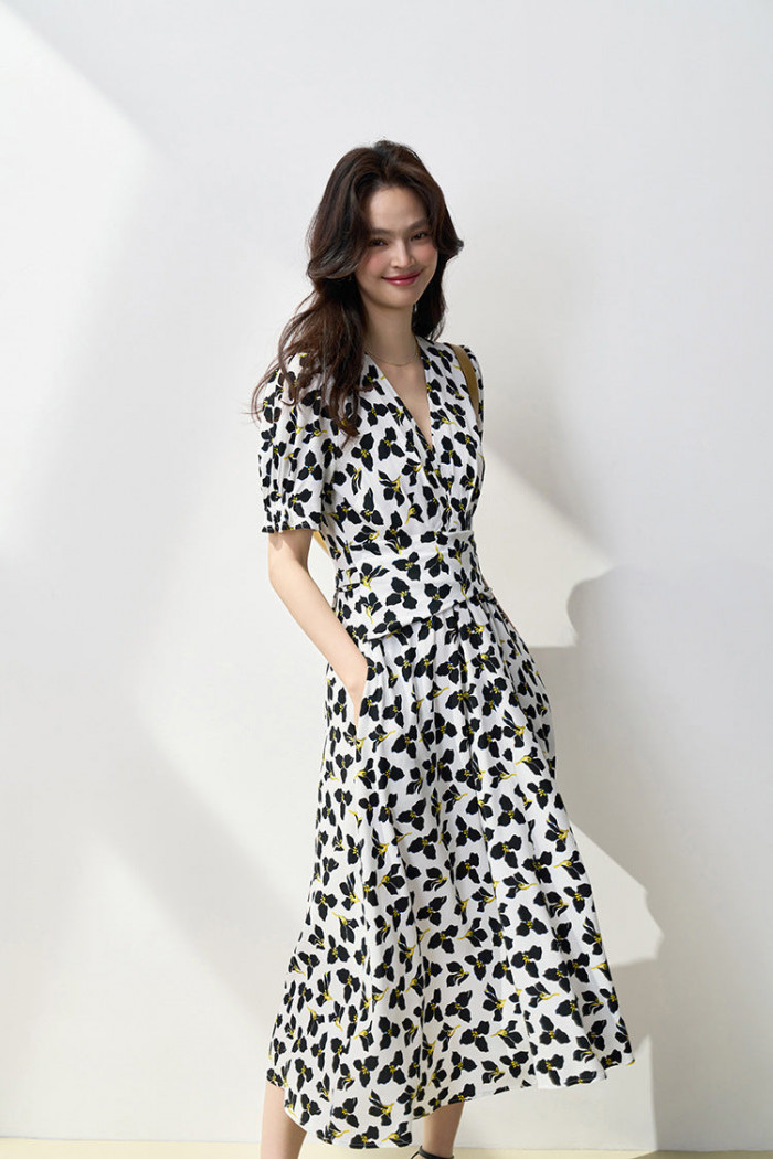 エレガントに映える「Vネック花柄ワンピース」