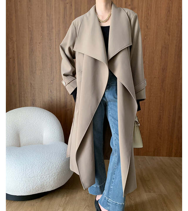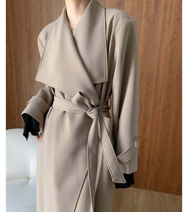 大きな襟が目を惹くこちらのコート。ボタンがなくベルトでフロントを閉じるタイプなので、オープンにすればさらにボリュームアップ。まさに着映え力抜群な1枚です。ボリューミーでもベージュだから貫録が出過ぎない。また、フロントを閉じればスマートに着こなせますよ。