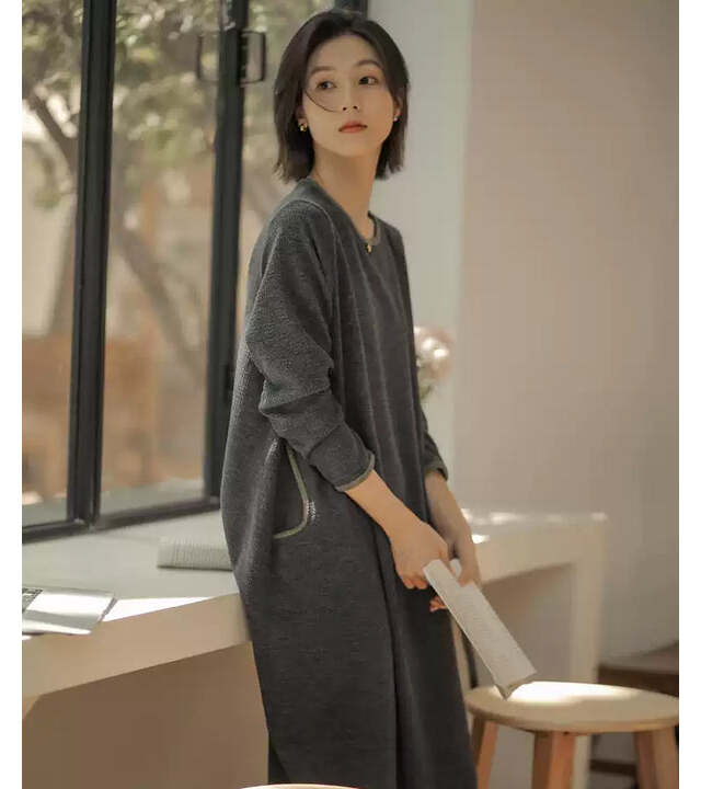 やわらかな肌触りが心地良いニット素材のワンピース。ふんわりとした風合いは見た目にも優しげです。ラウンド型のポケットやコクーンシルエットなど、全体的に丸みを帯びたデザインがかわいらしい。チャコールグレーのおかげで幼く見えないのが嬉しいポイントです。
