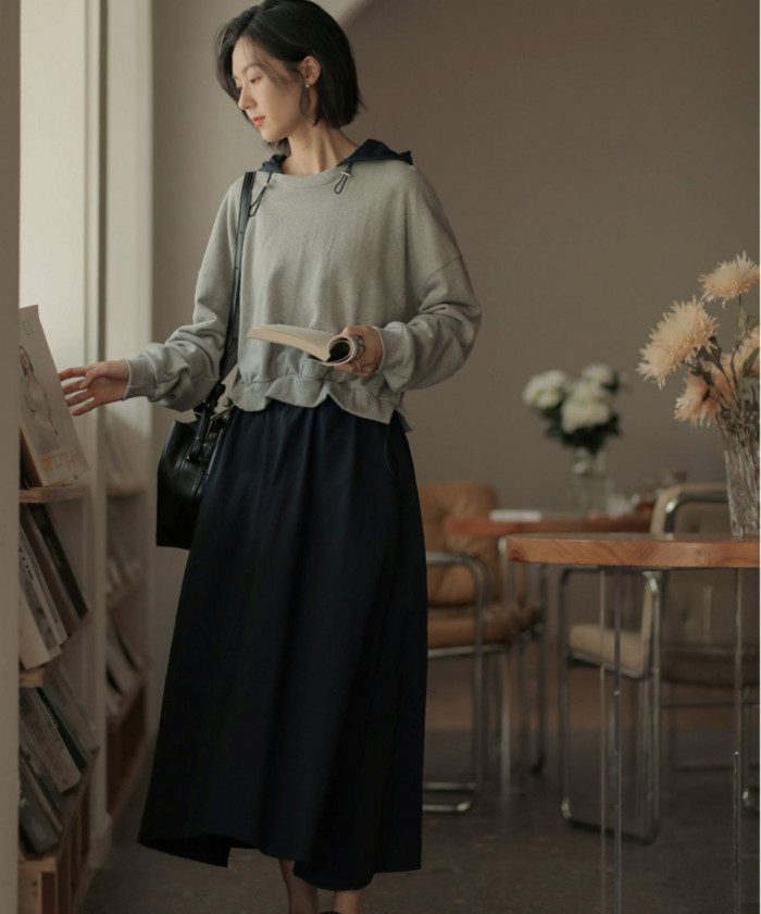 フード付きのカジュアルなデザインで日常にさらっと着られるワンピース。異素材を組み合わせることでツーピースのように見えるのが愉しいですね。着心地だけでなくコーデ不要なのもらくちんで嬉しい。フリルっぽいトップスの裾で洒落感もちゃんと感じられる1枚に。