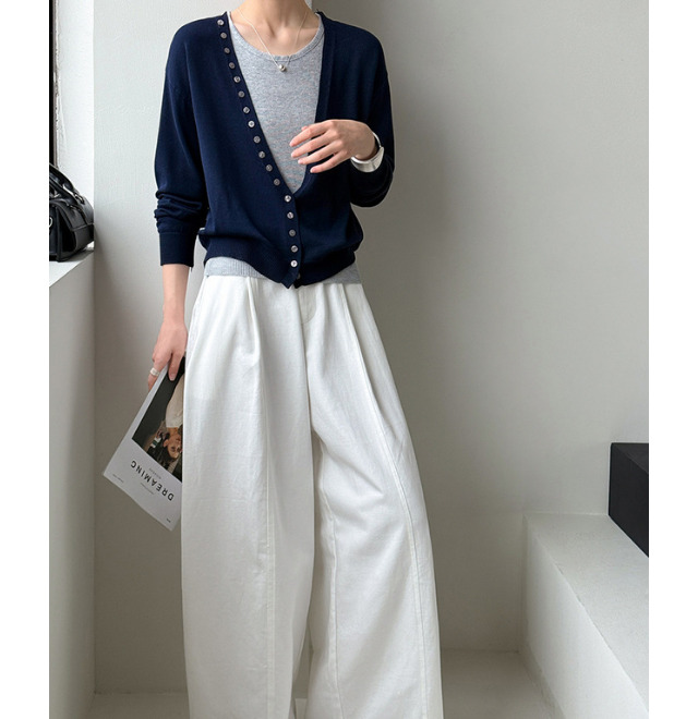 シンプルで合わせやすい王道のVネックカーディガンは、一枚あるだけでコーディネートの幅がグッと広がります。軽やかな薄手ニット素材だから、持ち運びも楽ちんで、冷房対策や季節の変わり目にも活躍!カジュアルからきれいめまで幅広いシーンで重宝する、頼れるデイリーアイテムです。
