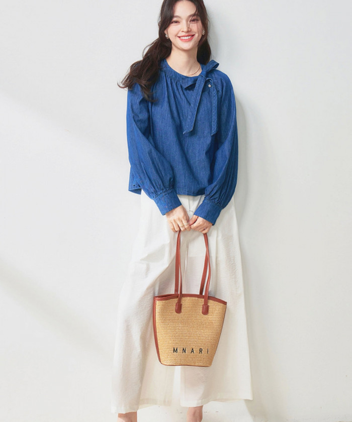 デザイン性のある白のブラウスは、1点投入するだけで着映えするアイテム。トップスに白を合わせることで、顔周りも華やかで明るい印象になります。首周りにあしらったモチーフは、巻いたり垂らしたりと着こなし自由。アレンジ次第で、自分らしいスタイリングを楽しめます。