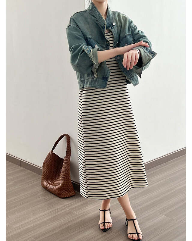 ボーダーワンピースにサラッと羽織って、リラクシーに見せつつ、違いを見せる首元で、よそ行きの見た目に昇格へ。