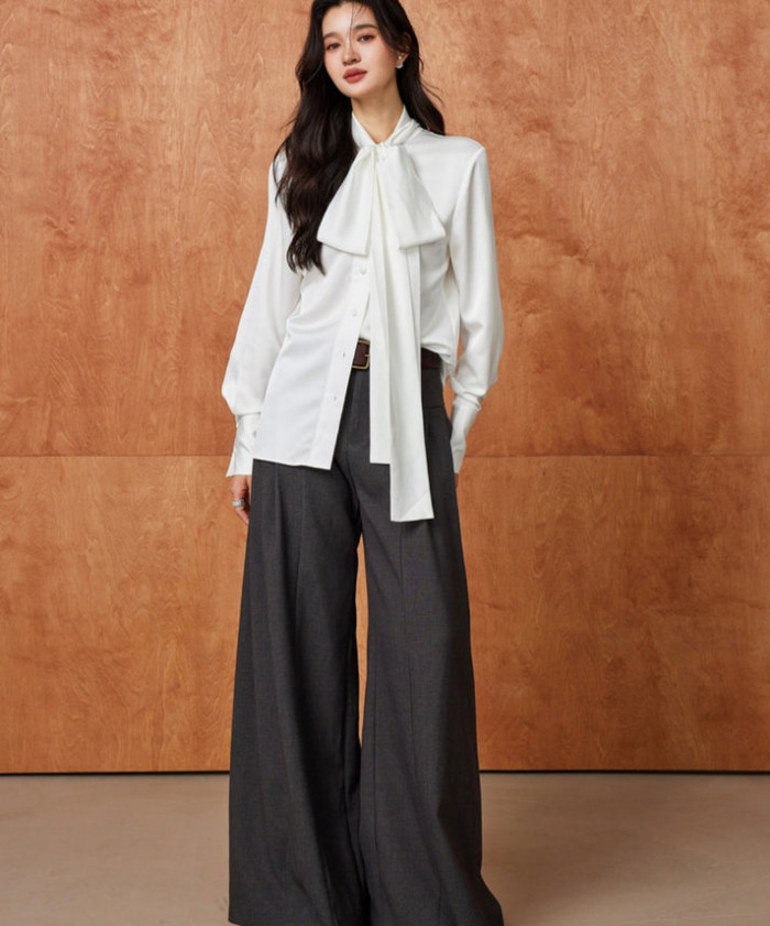 たっぷりとした分量感がありながらも、ウエスト位置を高く見せる設計で、脚のラインをすっきりと見せてくれます。落ち感のあるウール混素材がつくるドレープは、歩くたびに揺れ、凛とした存在感を演出します。無彩色のコーデに立体感をもたらす、秋に欠かせない一本です。