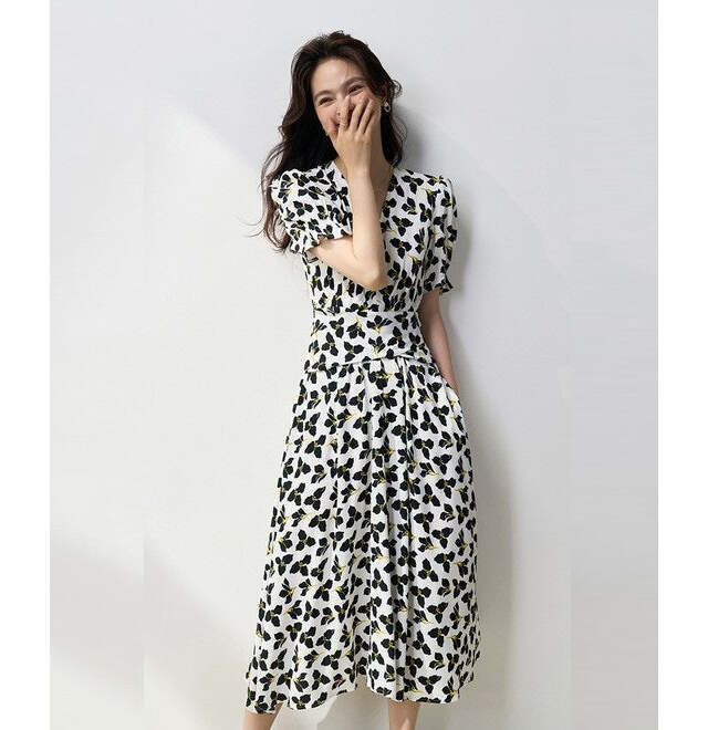 ホワイトを基調にしたワンピースは、モノトーンの中でも軽やかな印象をもたらします。繊細なフラワーモチーフが散りばめられ、華やかでありながら決して主張しすぎないデザインです。ウエストのシェイプとミディ丈のバランスが美しく、動くたびに表情を変えます。