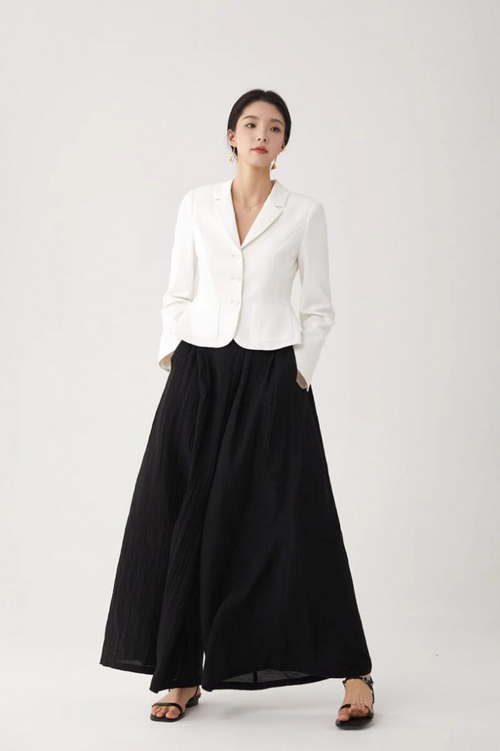 直線と曲線が交わる美しいワイドパンツは、モノトーンスタイルの要。
