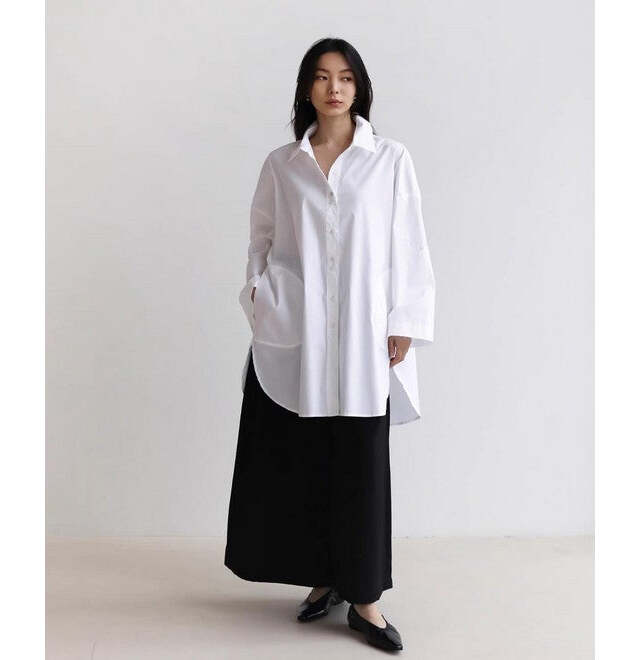 白のシャツは、モノトーンスタイルの“静かな主役”。オーバーサイズのシルエットにより、クリーンさの中に抜け感を演出します。上質なコットン素材がもつ張りと柔らかさのバランスが絶妙で、ボタンを開けて羽織っても、タックインしても、凛とした印象を保ちます。無彩色だからこそ際立つ、素材とフォルムの美しさを感じさせる一枚です。