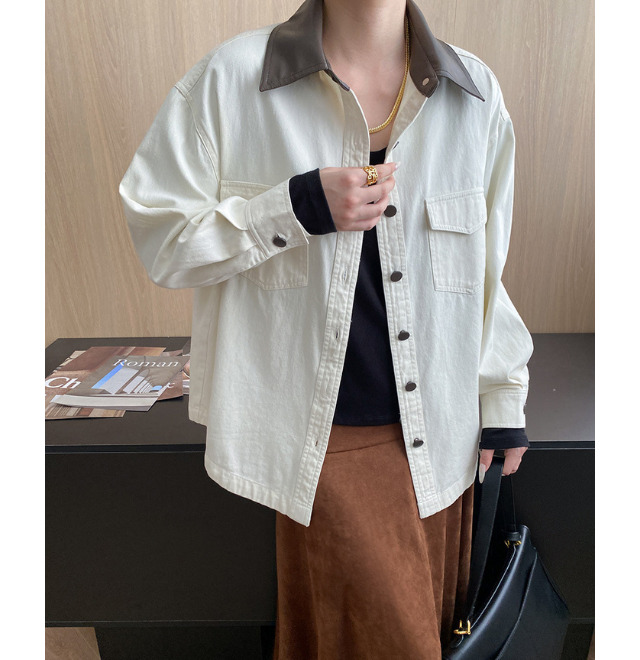 レザーカラーが目を引くジャケットは、異素材のコントラストが今っぽさをぐっと引き上げてくれる一着。ベージュやブラウンのやさしい配色だから、秋色スカートとも好相性。さらっと羽織るだけで抜け感とこなれ感、両方が手に入ります。