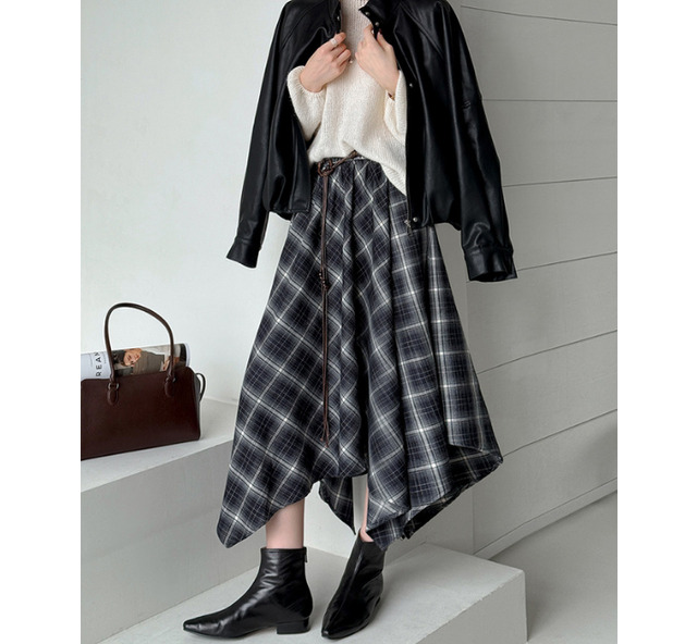 クラシカルなチェック柄に、前後差のあるフィッシュテールが動きを添えるハイウエストスカート。