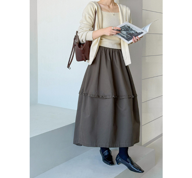 シンプルなトップスに合わせるだけで、ぐっと華やかに仕上がるボリュームスカート。ふんわりと広がるシルエットが、秋らしい空気感とモードなニュアンスをプラスしてくれます。大人の余裕を感じさせる、ちょっとだけ冒険したい日のコーデにおすすめの一枚です。