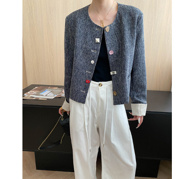 すっきりとしたノーカラーに、アクセントボタンが映える主役級ジャケット。