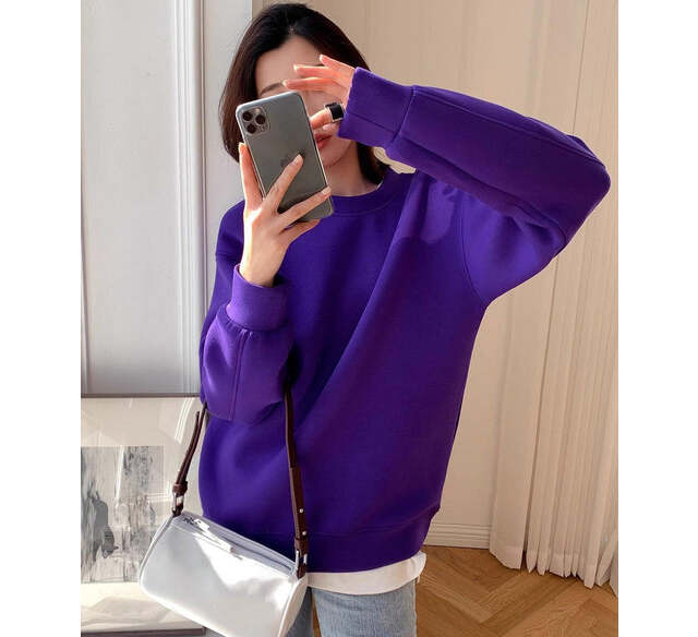 カジュアルなスウェットも、トレンドのパープルを選べば一気に旬顔に。