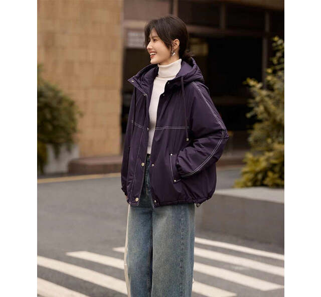 アウトドア感のあるマウンテンジャケットも、パープルカラーでぐっと都会的な印象に。