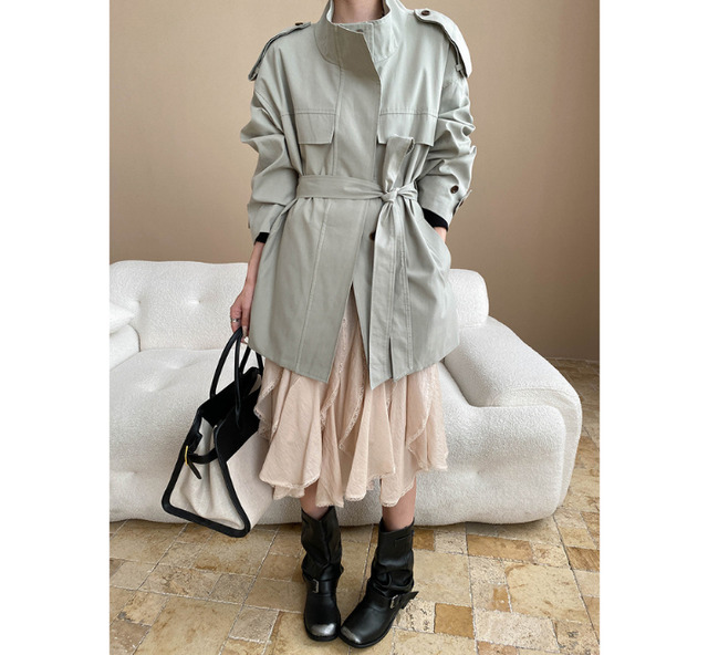 スタンドカラーが顔まわりをすっきり見せ、背中のレースアップがさりげないアクセントに。