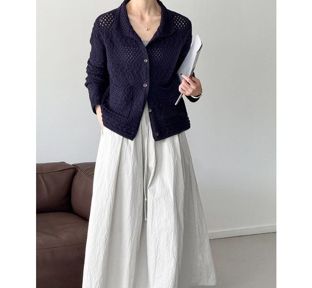 透け感のある編み目が女性らしさを引き立て、インナーとのレイヤードも楽しめます。