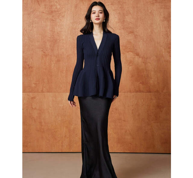 ウエストからふんわり広がるペプラムシルエットが、女性らしさとエレガントさを引き立てるカーディガン。