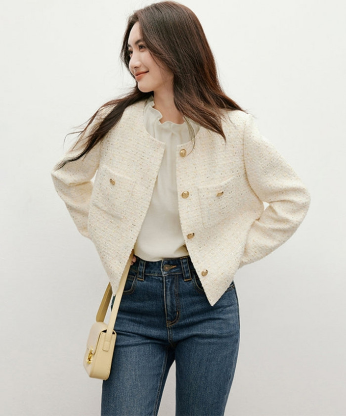 色々なボタンを並べた遊び心満載のノーカラージャケット。