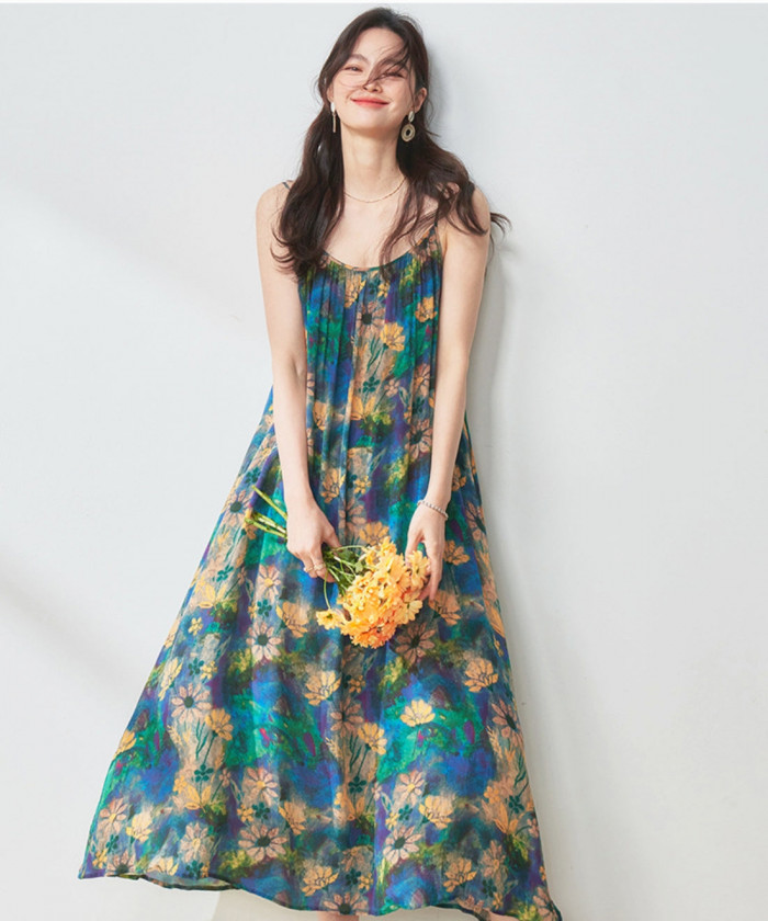大胆な花柄も、ベースの色味を抑えることで大人っぽい印象に。幼く見えがちなキャミソールデザインも、長めの丈を選ぶことで上品さを演出できます。少女らしさと大人らしさのバランスが絶妙なワンピースです!