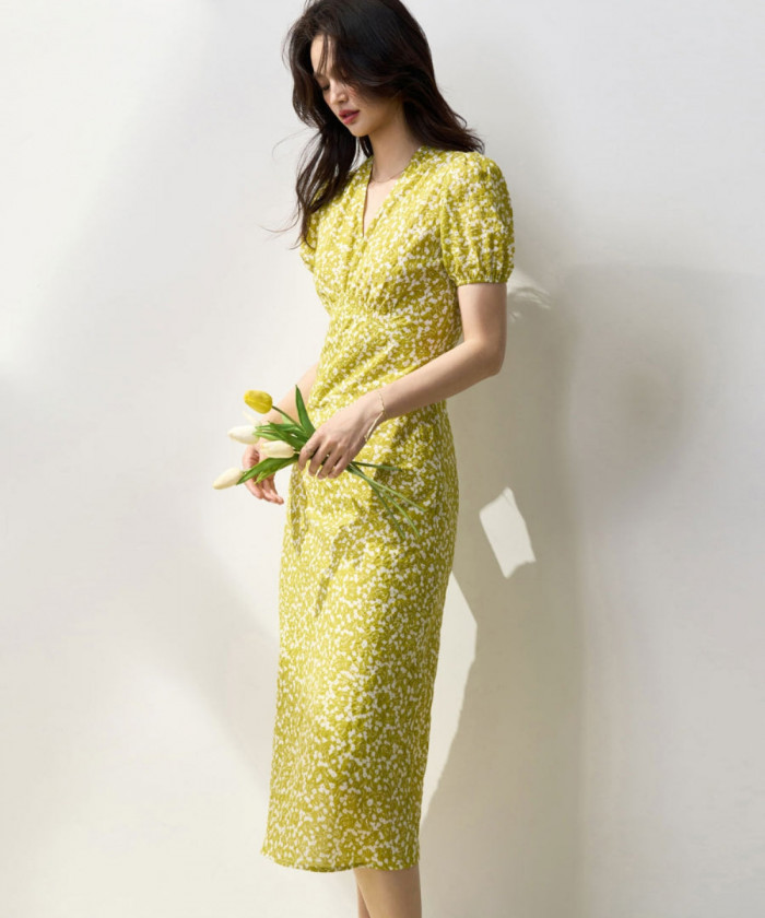 子供っぽく見えてしまいがちな明るめカラーには、細かな花柄とシルエットで大人らしさをプラス。きゅっと締まったウェストとストンと落ちるスカートラインがスタイルを綺麗に見せてくれます。スニーカーと合わせれば、ピクニックコーデにも!