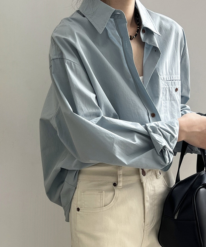 夏は爽やかなブルーと白のボトムスでコーデを仕上げていた人も、少しくすみのあるブルーに変えるだけで一気に秋らしさを演出できます。リラックス感漂うオーバーサイズのシャツもブルーなら大人の女性らしい垢抜けた印象に。