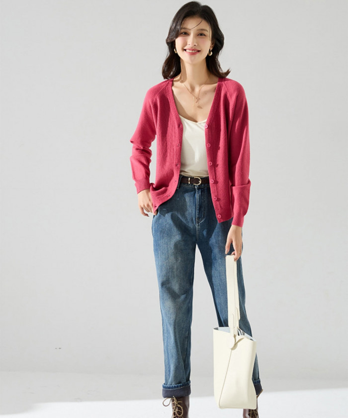 鮮やかなピンクの色味が上品キュート。Vネックカーディガン