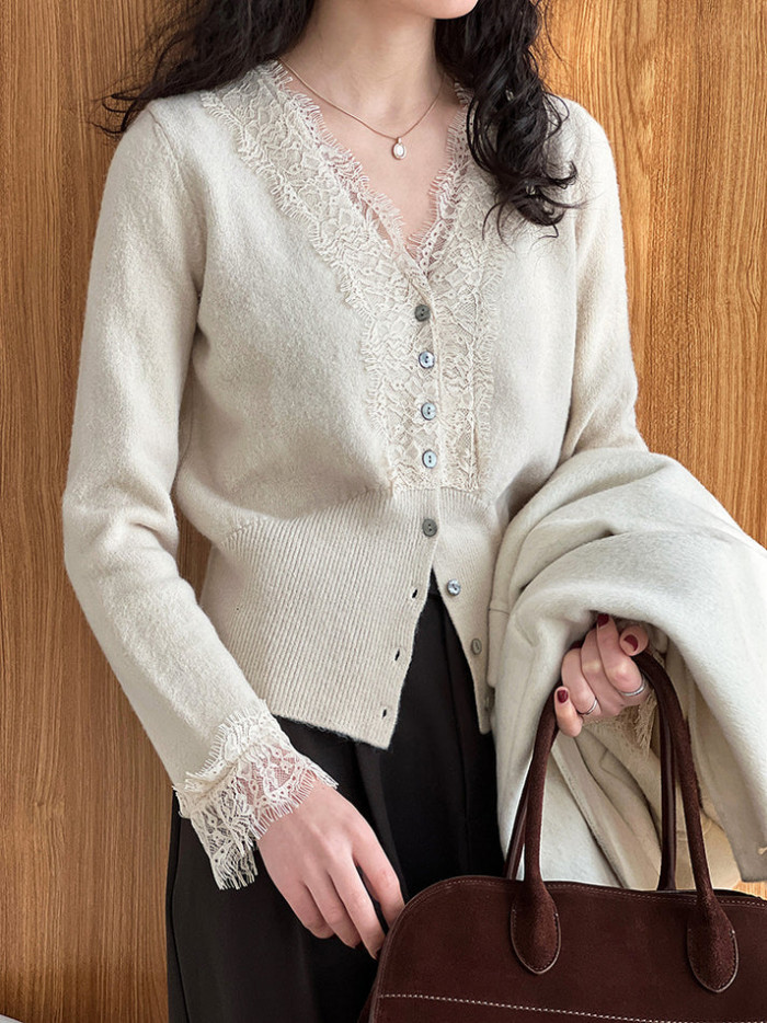 襟と袖にはレースをあしらい、裾はラウンド型の細リブに。ドレッシーなデザインが素敵です。