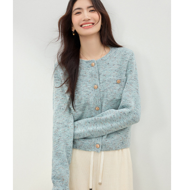 色糸がちりばめられて可愛らしい、ミックスヤーンのラウンドネックカーディガン。