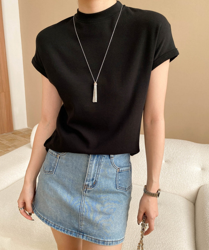 ハイネック寄りのデザインが上品な印象を与える一方、フレンチスリーブの軽やかさで抜け感をプラス。単品でもコーデが決まりやすく、ジャケットやカーディガンのインナーにもぴったり。きれいめにもカジュアルにも対応できる万能な一枚です。