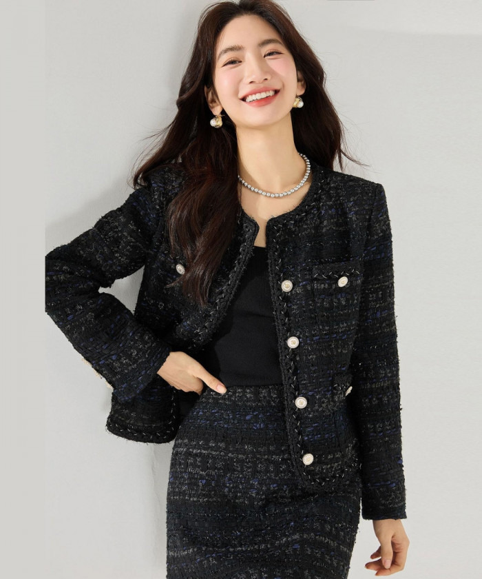 光沢感のある糸を織り込んだ、華やかなシャイニーツイード素材のノーカラージャケット。フォーマルにも映える上品さがあり、パーティーや特別なシーンにもおすすめです。ノーカラーのデザインは顔まわりをすっきり見せ、アクセサリーとの相性も抜群。クラシックとモダンを絶妙に融合させた一着です。