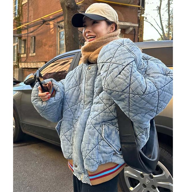 寒い日でもデニムジャケットを着たい人におすすめ。デニムっぽく造られたキルティングコートです。メンズライクと言うよりはボーイッシュ。それでいて広めのキルティング幅やボリューム感がラグジュアリー。きれいめスタイルに重ねたカジュアルミックスコーデもアリです。