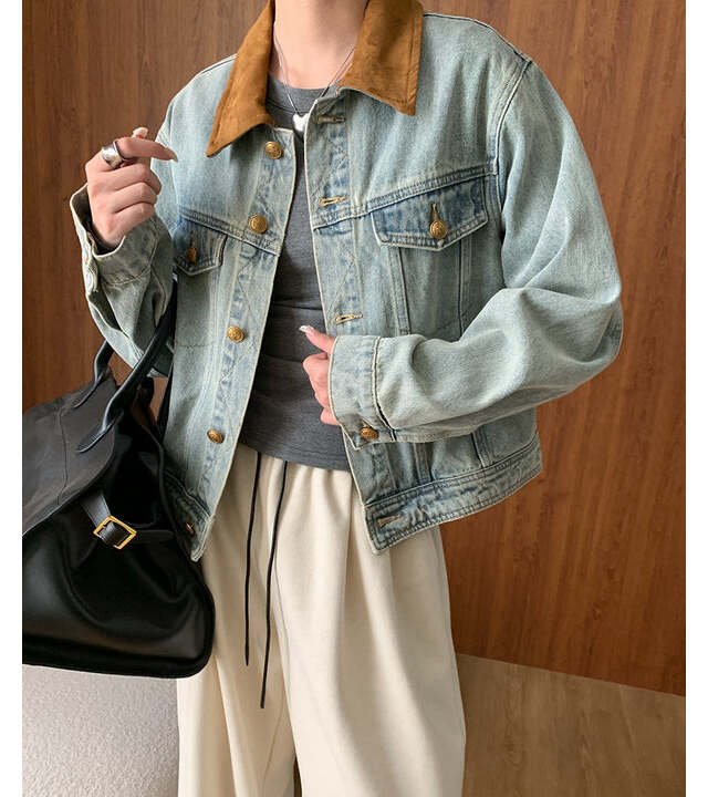 スウェード生地の襟とウォッシュドデニムの風合いがメンズライクなデニムジャケット。ウエスタン調にもヴィンテージ風にも見えてコーデを考えているだけでも愉しくなります。あえて馴染のスウェット&Tシャツに合わせたスタイルも、こなれて見えておしゃれですね。