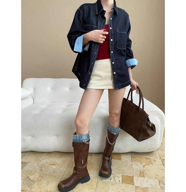 長めの丈が新鮮に感じるこちらのデニムジャケット。ステッチを効かせたワークスタイル風がお洒落です。ルーズなパンツに合わせたカジュアルコーデも今年っぽいけど、ワンランク上の着こなしを狙うならミニスカートとのミックスコーデがおすすめです。