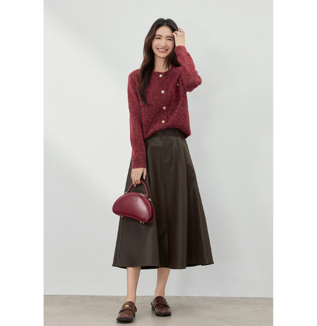 レッドを優しく魅せるミックス毛糸のカーディガン